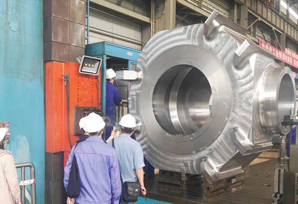 二重装备制造的福清核电项目核电泵壳加工现场(唐磊 摄)