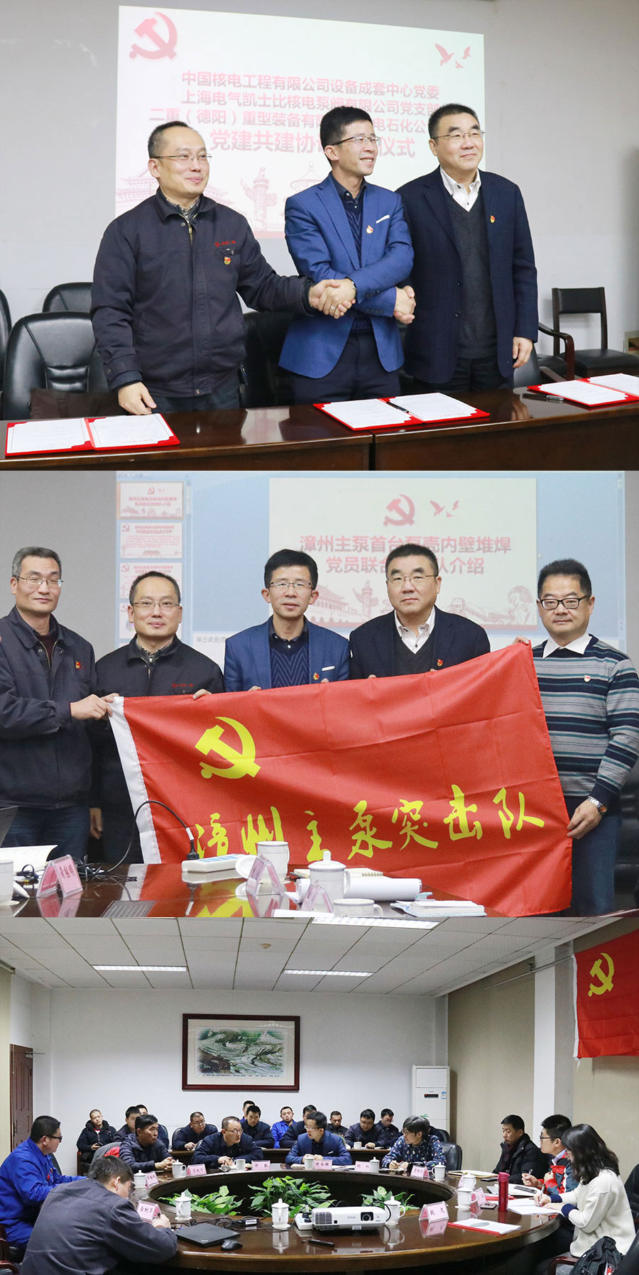 会上,共建三方对漳州主泵项目的整体进展情况、推演行动项、机加工经验反馈等进行了汇报,举行了党建共建协议签字仪式、突击队授旗仪式,并围绕党的十九大精神讲了一堂别开生面的专题党课。