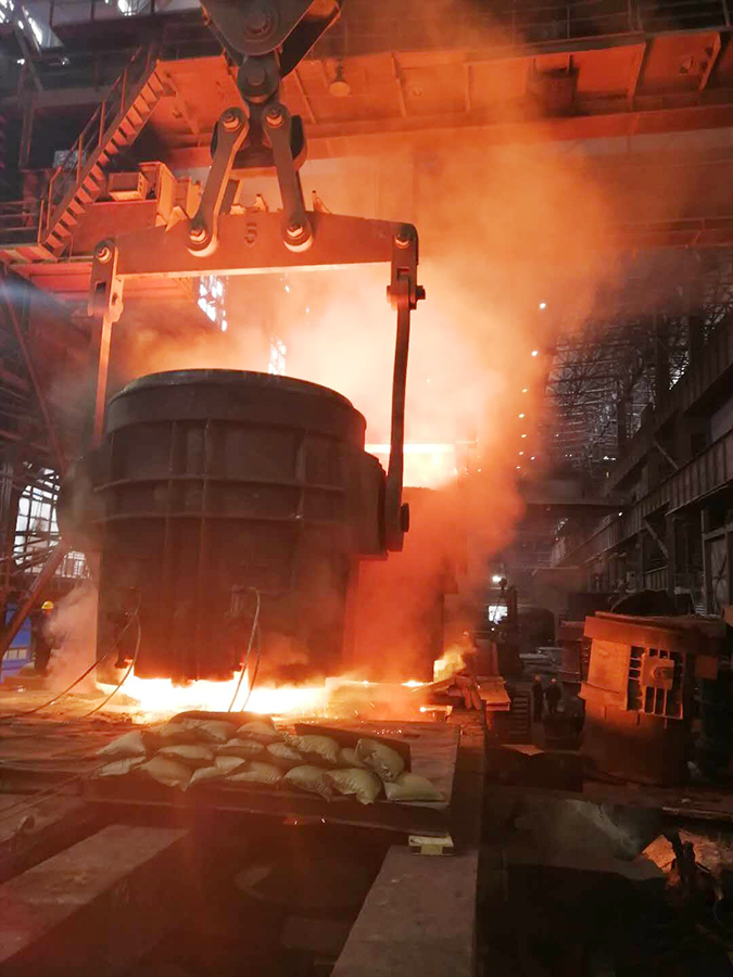 在现场,天车工娴熟的操作重型行车满载着红彤彤的钢水隆隆地驶向浇注区,和着天上地下默契的配合,巨型钢包缓缓开启,殷红的钢水注入大型模具中,一切都在按照工艺计划执行,历时一周的努力,终于结出硕果,二重装备今年第一次双包合浇,一天内连续浇注两件牌坊的任务圆满完成。