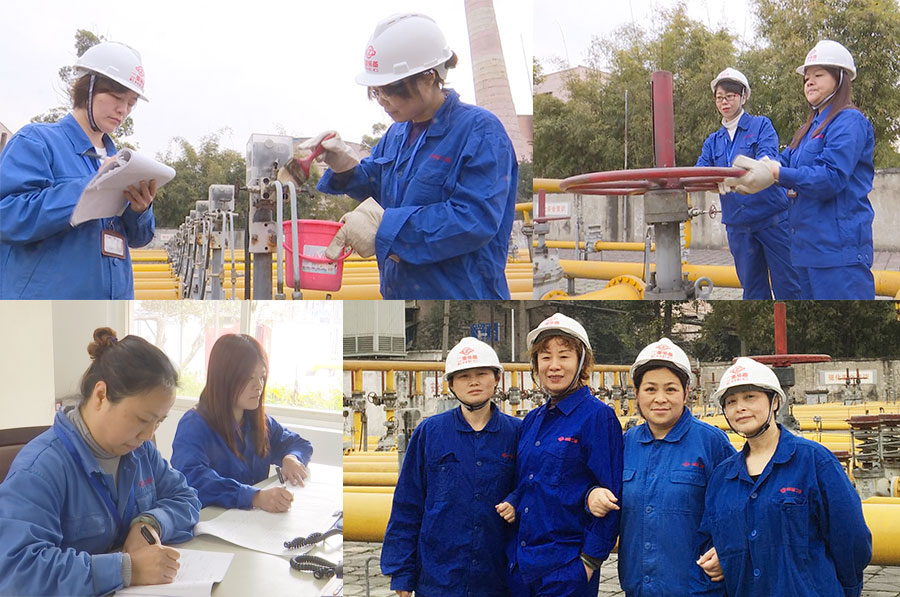 二重装备的西北一隅, 2000平方米的天然气配气站管网密布,调配设备众多,这里是公司金属热处理、金属加热锻造、天然气燃气锅炉用能的源头。动能分公司动力车间天然气配气组10名女职工24小时轮班作业,辗转在3个进站气源,15条出站分配线路上,她们每天的工作就是转动10余个阀体高达1.5m,操作手轮直径近800mm的DN400的调节阀,露天作业的辛苦自不待言,单是旋转硕大的调节阀就不是一件轻省的事情。一个人转动吃力,就两人合力完成,365个黑夜白昼从不间断,风雨无阻。