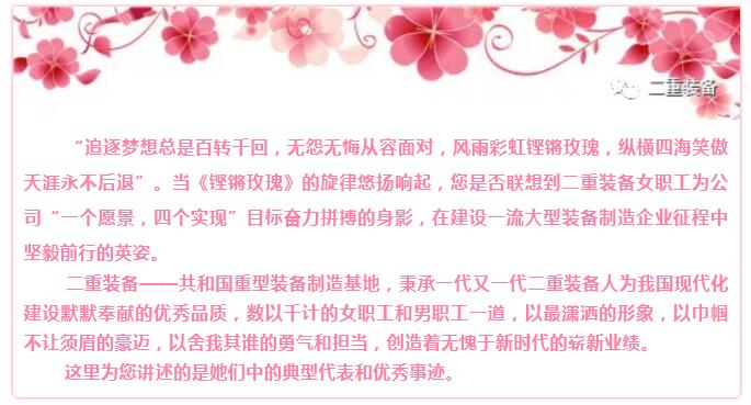 严格执行动能调度指令,“多家联合供气”、“双人联动操作”,年均完成天然气年输气量8900万立方米,天然气输差控制在1.5%左右,为公司节约费用近100万元,建站12年,设备事故和安全生产事故为零。10名女工凭着她们的执着和坚韧,为二重装备的发展默默地奉献着,她们用智慧、用勤劳的双手编织者二重装备装备中国的美好图景,向人们展示“先进班组”、“降本增效”专项活动“优胜班组”、“女职工建功立业标兵岗”的风采。
