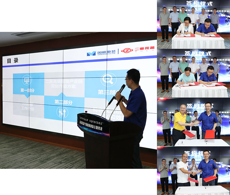 二重装备战略科技部副部长董涛介绍了二重高端装备产业园大中小企业融通双创特色载体情况,并与四川建筑职业技术学院、四川工程职业技术学院、成都希盛知识产权代理有限公司和同方知网(北京)技术有限公司四川分公司分别签订了项目合作协议书。
