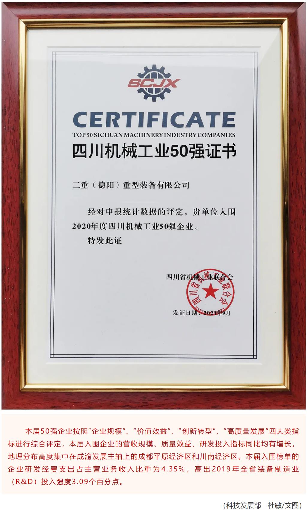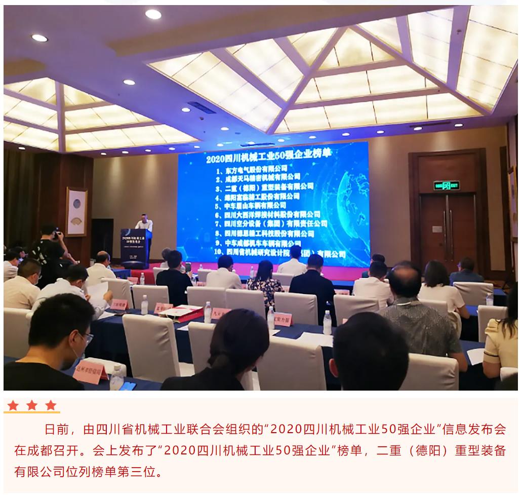 二重装备位列“2020四川机械工业50强企业”榜单前三强